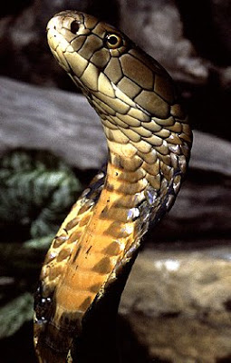 15.งูจงอาง ( Ophiophagus hannah ) ลักษณะเด่น งูจงอางเป็นงูพิษที่มีลักษณะหัวกลมมน เกล็ดบริเวณส่วนหัวใหญ่ มีเขี้ยว 2 เขี้ยวที่ขากรรไกรด้านบน หน้าตาดุดัน จมูกทู่ มองเผิน ๆ คล้ายกับงูสิงดง ที่บริเวณขอบตาบนมีเกล็ดยื่นงองุ้มออกมา ทำให้หน้าตาของงูจงอางมองดูดุและน่ากลัว ส่วนบริเวณท่อนหางจะมีลักษณะคล้ายคลึงกันมากที่สุด มีม่านตากลม ลำคอมีขนาดสมส่วน ลำตัวขนาดใหญ่เรียวยาว แผ่แม่เบี้ยได้เช่นเดียวกับงูเห่า งูจงอางที่ยังไม่โตเต็มวัย จะมีขนาดลำตัวเท่ากับงูเห่าดงแต่จะยาวกว่า ทำให้คนทั่วไปที่พบเห็นและไม่เคยเห็นงูจงอางมาก่อน จะเข้าใจผิดว่าเป็นงูเห่าและเรียกว่างูเห่าดง |