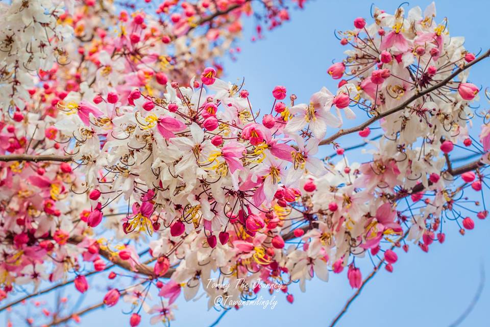 ดอกออกเป็นช่อตามกิ่งก้านมีกลิ่นหอมมีสีชมพูแกมขาวดอกบานจะมีความกว้างประมาณ 23 เซนติเมตร มีกลีบดอก 5 กลีบ ตรงกลางดอกจะมีเกสรตัวผู้สีเหลืองผลเป็นฝักกลม ยาว มีสีดำ เมื่อแก่เนื้อในฝักมีสีขาวกั้นเป็นชั้น ๆ แต่ละชั้นจะมีเมล็ดเรียงอยู่ภายใน ฝักหนึ่งยาวประมาณ 15–30 เซนติเมตร มีลักษณะใบ เป็นพุ่มใบแบนกว้าง