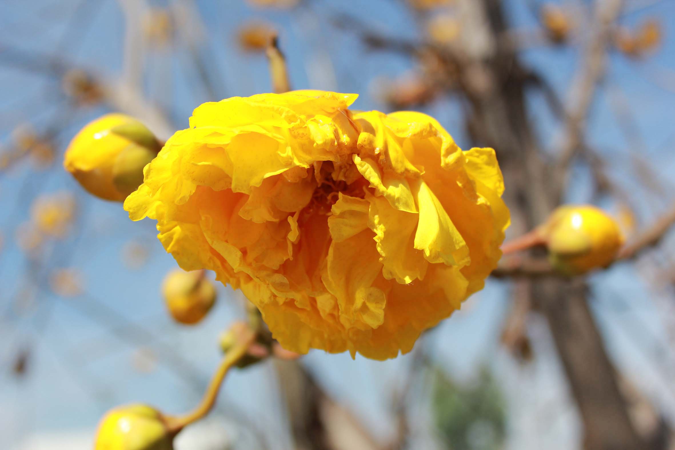2. Cochlospermum religiosum (L.) Alston หรือสายพันธุ์กอสไซเปียม (gossypium) เป็นสายพันธุ์จากทวีปอินเดีย ชื่อสามัญคือ silk-cotton tree หรือ cotton tree ลักษณะเด่นคือใบเป็นแฉกลึก 30-35% แผ่นใบหนา กิ่ง ก้านใบ และผิวใบด้านล่างมีขนหนานุ่ม ดอกเป็นช่อแบบช่อกระจะ เป็นดอกสมบูรณ์ กลีบเลี้ยง 5 กลีบ ร่วงยาก กลีบดอก 5 กลีบสีเหลืองสด ร่วงง่าย เกสรเพศผู้จำนวนมาก รังไข่อยู่เหนือวงกลีบ ผลแบบแคบซูลรูปไข่ เมล็ดรูปไตหรือรูปก้นหอย หุ้มด้วยปุยสีขาว มีทั้งหมดจำนวน 4 เหมือนกับพันธุ์กลีบดอกชั้นเดียว