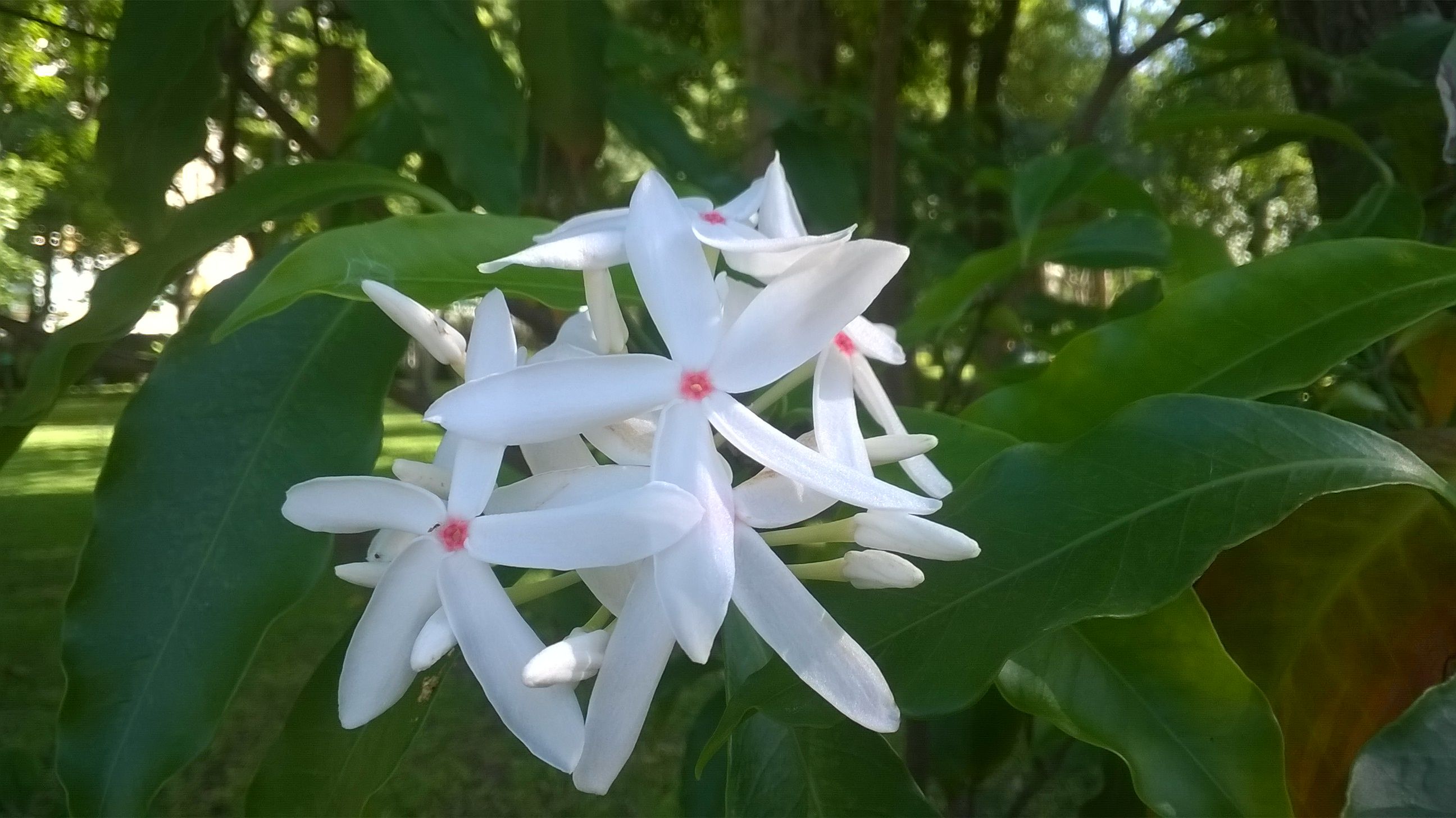 ดอก : สีขาว กลิ่นหอมอ่อนๆ ออกเป็นช่อแบบช่อกระจุกที่ซอกใบและปลายกิ่ง ใบประดับ 1 คู่ ออก ตรงข้าม รูปแถบยาว แต่ละช่อย่อยมีดอกย่อย 3 ดอก โคนกลีบดอกเชื่อมติดกันเป็นหลอดแคบมีขนาดไม่เท่ากัน ตรงโคนสีแดงส้ม มีขน ปลายแยกเป็น 5 แฉก รูปขอบขนาน ปลายมน ดอกกลางบานก่อนดอกบานเต็มที่กว้าง 2.5-4.0 เซนติเมตร