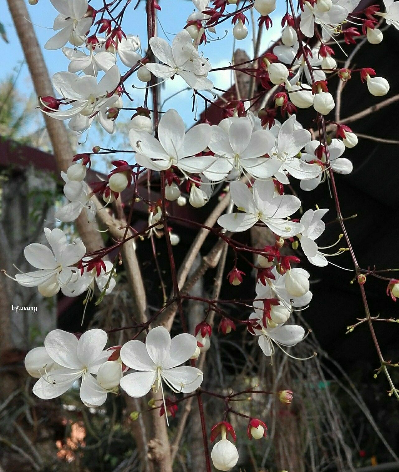 เป็น ไม้พุ่มขนาดเล็ก ใบรูปไข่ปลายใบแหลม ขอบใบเรียบดอกออกเป็นช่อตามยอด หรือที่ปลายกิ่ง ก้านดอกยาวประมาณ 25 ซม.ก้านดอกเล็กเรียวคล้ายเส้นด้าย กลีบรองดอกรูประฆัง สีแดง กลีบดอกมีสีขาวปลายแยก 5 กลีบ ออกดอกช่วงเดือนมิถุนายนไปจนถึงหน้าหนาว ประมาณเดือน ธันวาคม-มกราคม ระยะการบานของดอกนานเป็นเดือน ช่อดอกจะบาน และยาวออกมาเรื่อยๆ จนยาวเป็นเมตรจนกว่าจะบานหมด