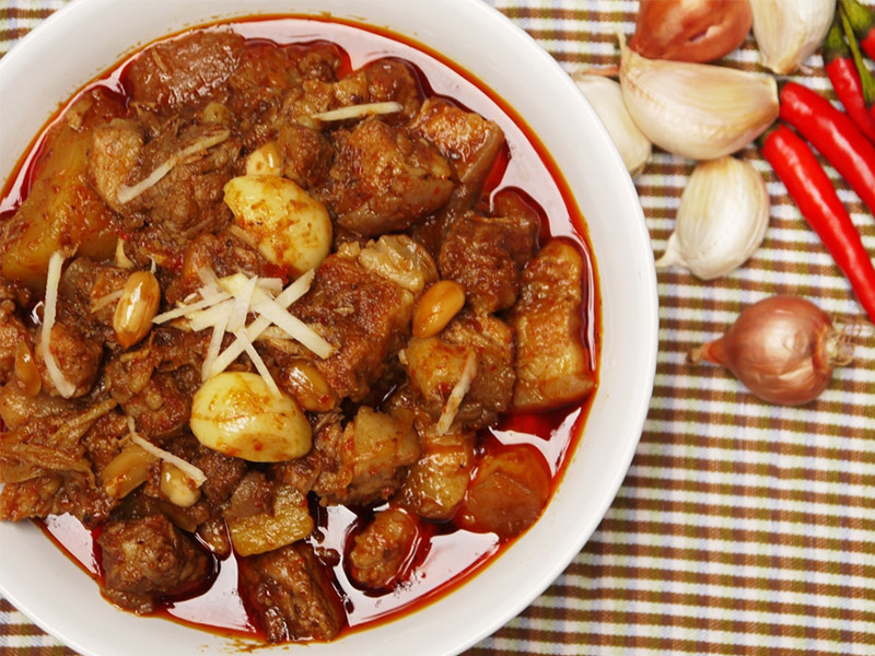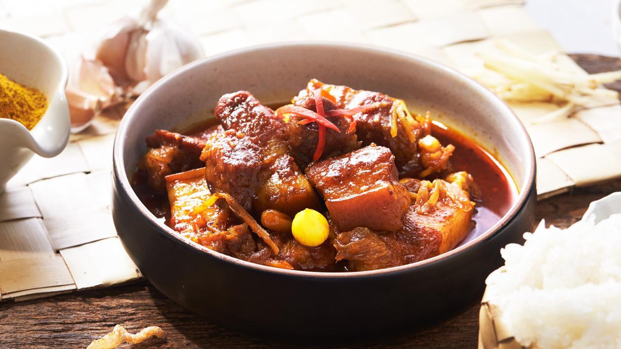 นำหมูที่หมักไว้มาตั้งไฟ ใส่น้ำเล็กน้อย ผัดต่อจนหมูเริ่มสุก คอยเติมน้ำเรื่อยๆ เคี่ยวต่อจนหมูเปื่อยได้ที่