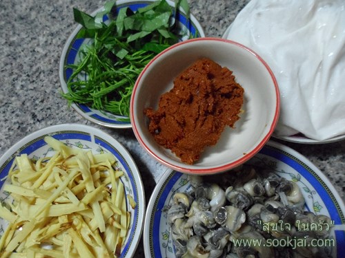 แบ่งกะทิเป็น 3 ส่วน นำส่วนแรกผักกับพริกแกง