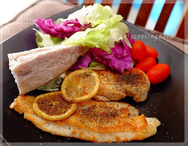 - พอปลาและไก่สุก จัดใส่จาน โรยเกลือและพริกไทยดำป่นเล็กน้อย (น้อยมาก ๆ เลยนะคะ เพราะจานนี้เราจะทานเนื้อปลาและไก่โดยรสเดิม ๆ ของเค้าจะหวานนิด ๆ อยู่แล้วค่ะ เพิ่มรสชาติหอมหวานเปรี้ยวนิด ๆ จากเลมอน โดยใส่เกลือและพริกไทยเพื่อเพิ่มรสชาติอีกนิดเดียวพอค่ะ)