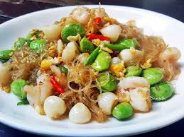 ใส่วุ้นเส้นเติมน้ำเปล่าเล็กน้อย ปรุงรสด้วยน้ำมันหอย ซีอิ้วขาวและพริกไทยป่น ผัดให้วุ้นเส้นเริ่มสุกใสแล้วจึงใส่กุ้ง