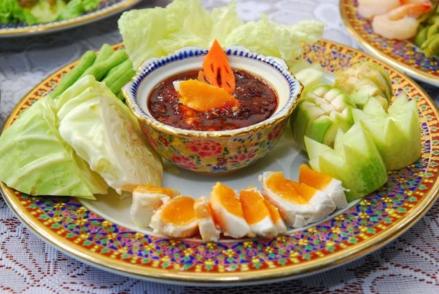 - เสริฟน้ำพริกใส่ชาม พร้อมด้วยเครื่องเคียงผักสดๆ ที่เตรียมเอาไว้แล้ว